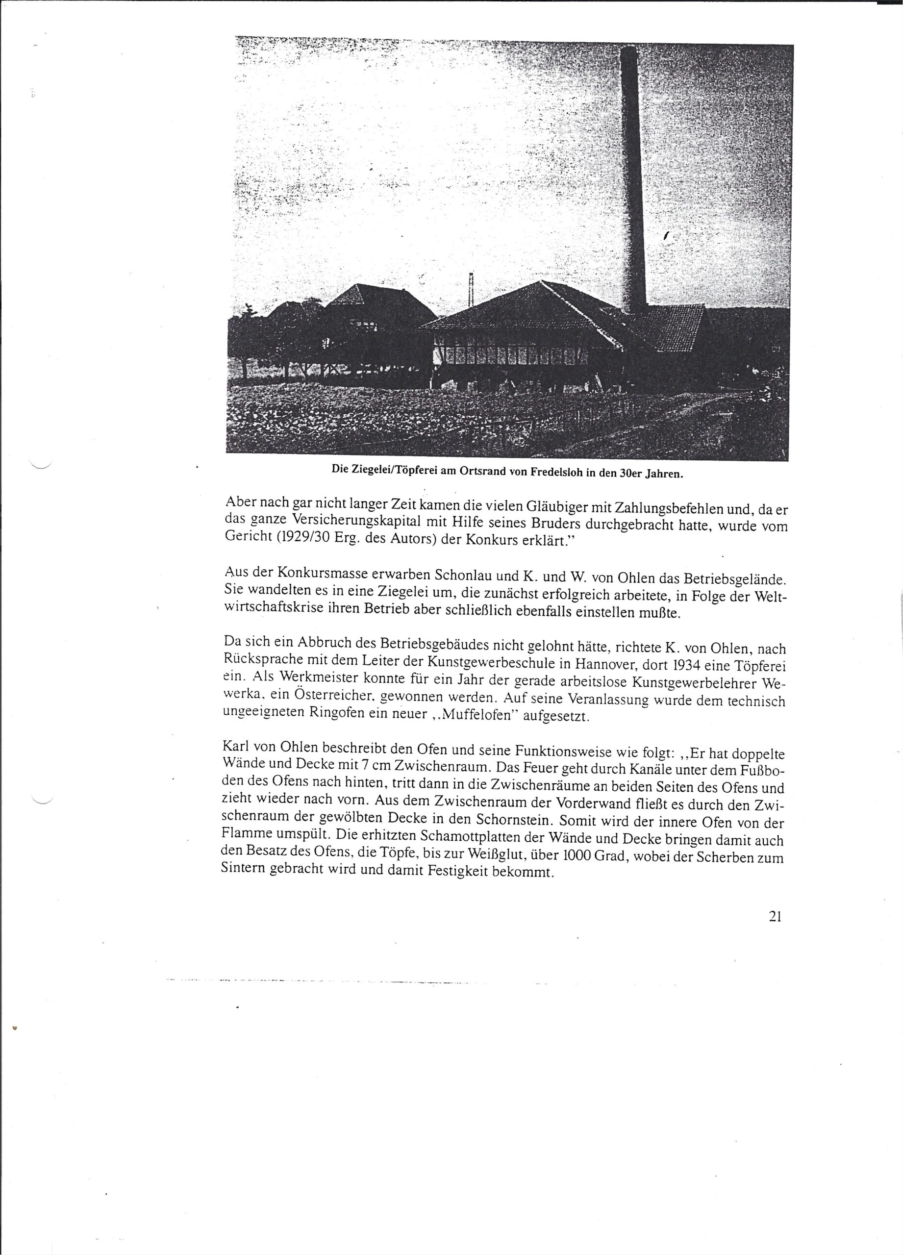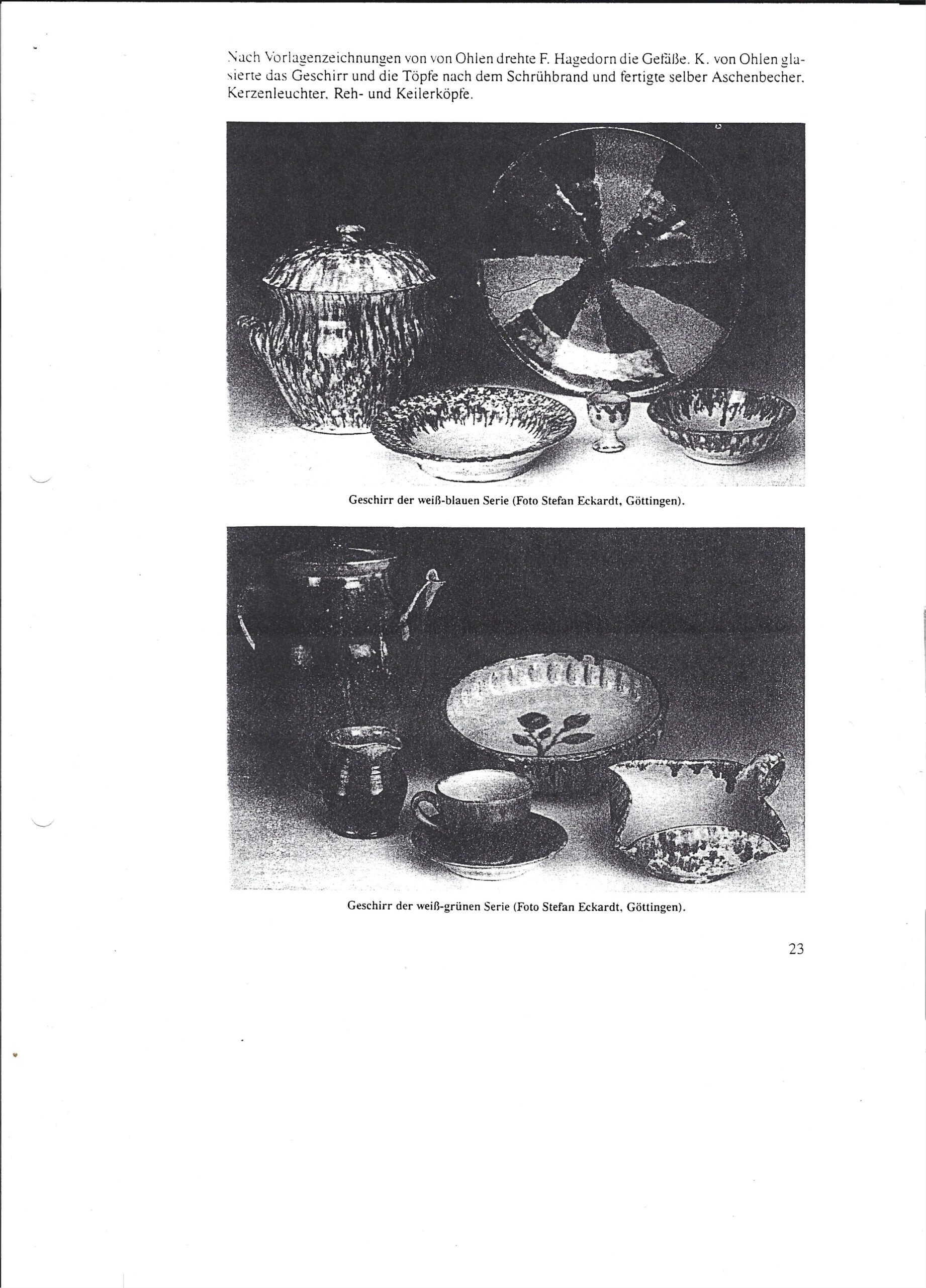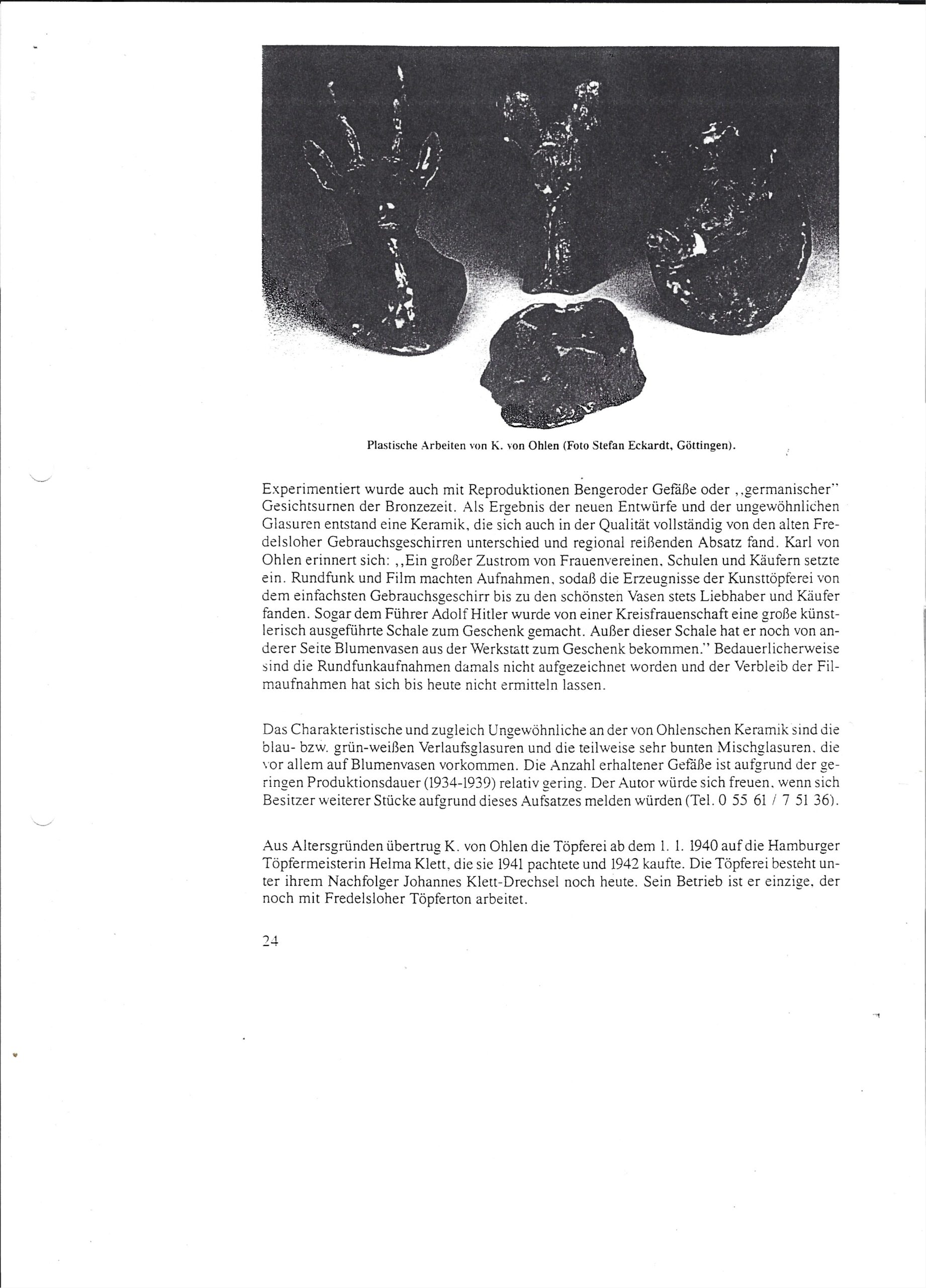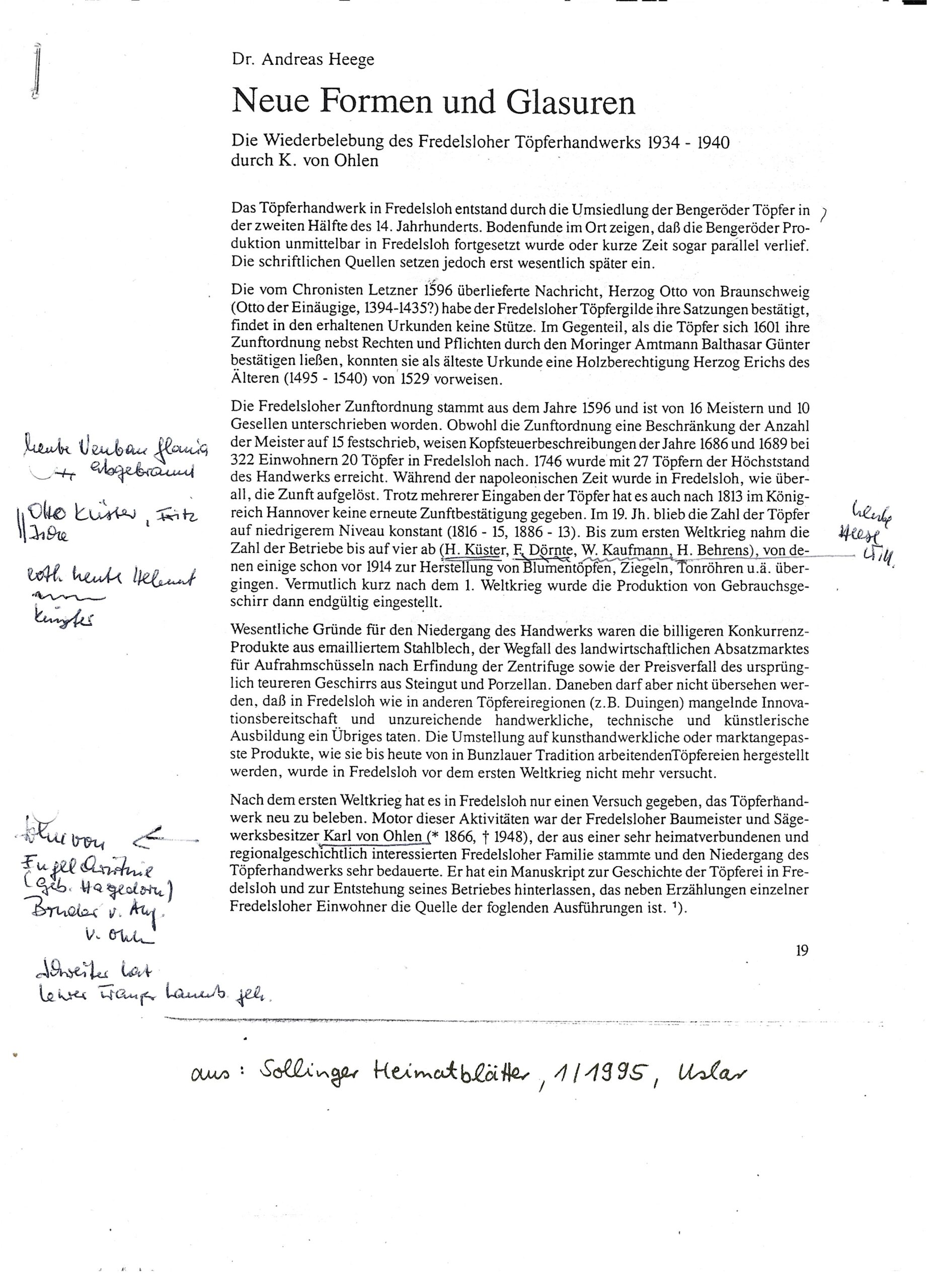 In den Sollinger Heimatblättern , 1/1995 beschreibt Dr. Andreas Heege unter der Überschrift „Neue Formen und Glasuren“ die Wiederbelebung des Fredesloher Töpferhandwerks 1934 – 1940 durch Karl von Ohlen. Als Töpfer arbeiteten dort W. Schröder und Fritz Hagedorn (Bild).