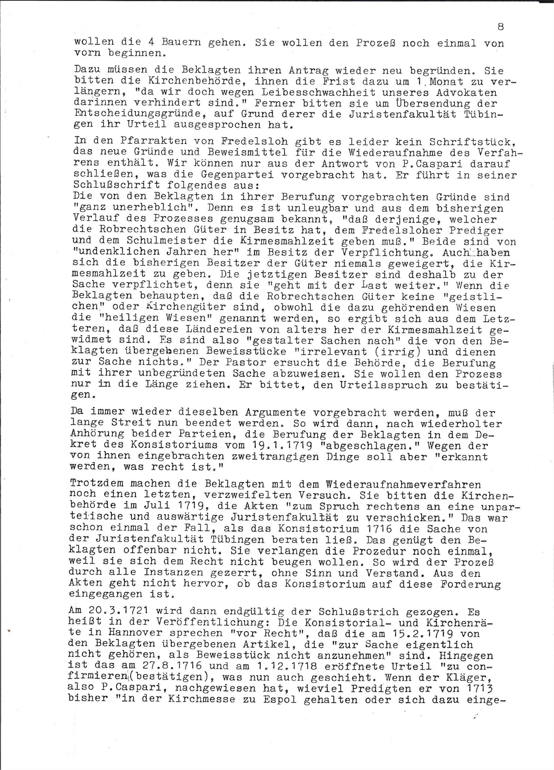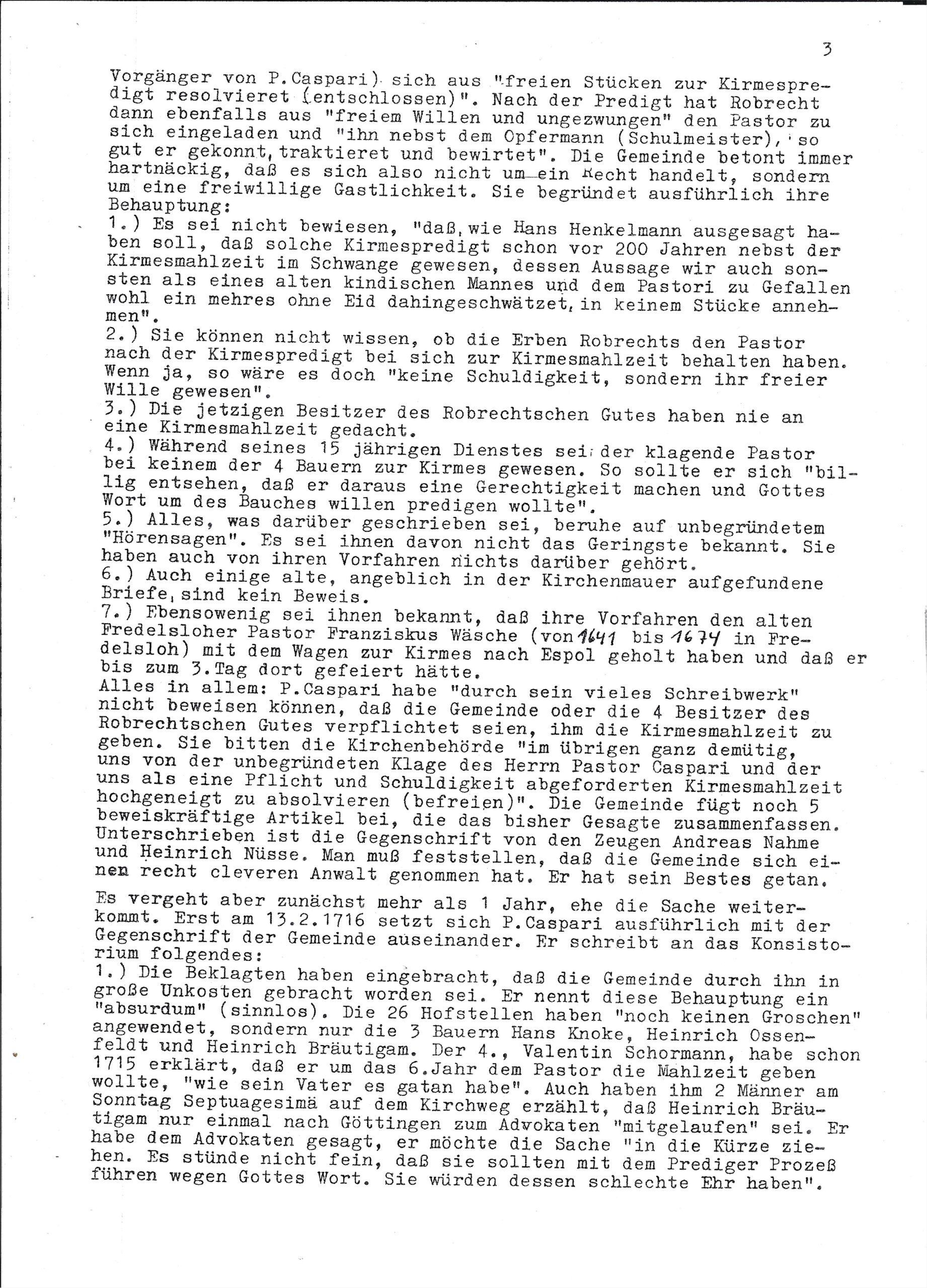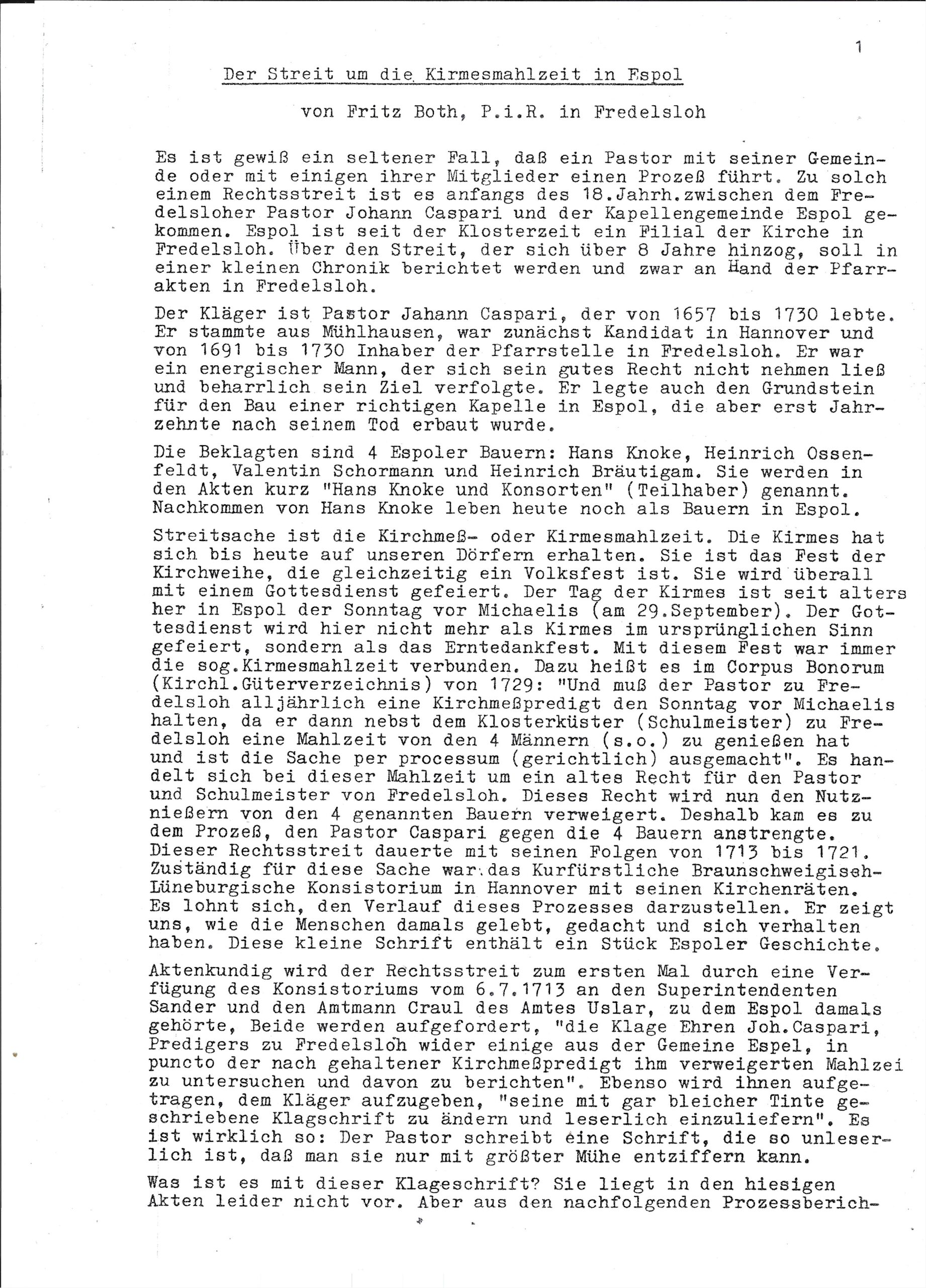 Den folgenden Aufsatz von Pastor Fritz Both erhielt ich von Arno Schelle, der ihn in der alten Schule fand. Pastor Both berichtet über den Streit des Pastors Johann Caspari, der von 1691 bis 1730 Inhaber der Pfarrstelle in Fredelsloh war. Es ging um die „Kirchmesspredigt“ am Sonntag vor Michaelis, gleichzeitig Erntedankfest und die damit verbundene Mahlzeit für den Pastor und den Schulmeister.