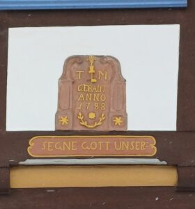 Die Tafel mit der Töpferscheibe zwischen zwei Säulen und den Buchstaben T M für Töpfermeister und der Jahreszahl 1788. Oben im Bild neben der größeren Tafel im ersten Stock unter dem rechten Fenster.