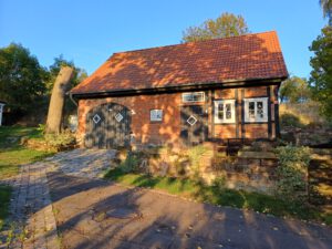 „Erbaut ca. 1860 Schweinemeister auf dem Kloster Heinrich Knoke + Charlotte geb. Böker links ? Küster, Kutscher auf dem Kloster„ E. Fischer Heinz Knoke (1921-1975) u. Lucie Knoke Lucie u Hasso Gottschalk (1931-2002)