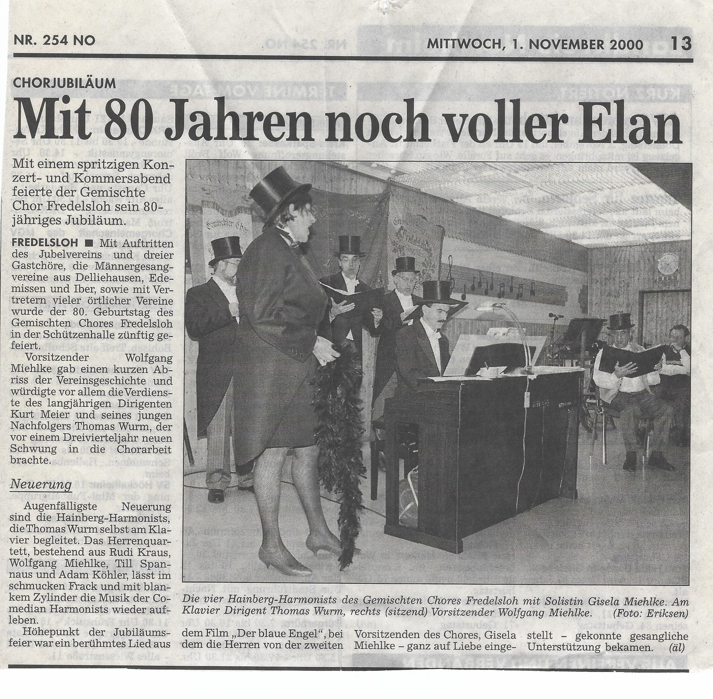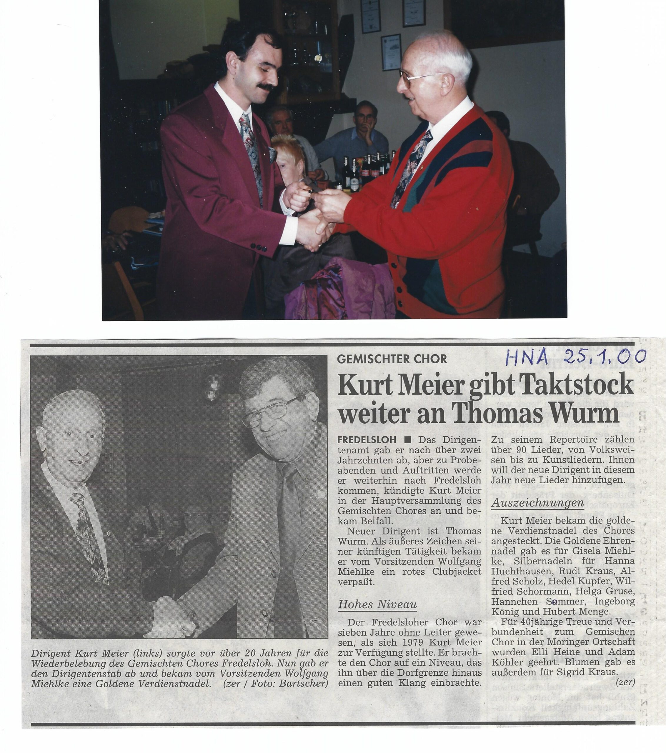Erst 1983 mit dem 1. Vorsitzenden Adam Köhler und dem Dirigenten Kurt Meier lebt die Chorarbeit wieder auf. Nach dem Wegzug von Kurt Meier wird Heiko Gorf Chorleiter. 1981 feiert der Gemischte Chor sein 60-jähriges Bestehen und 2001 das 80-jährige Bestehen. Auf dem Bild der damalige Vorsitzende Wolfgang Miehlke und der Chor unter der Leitung von Thomas Wurm, der den Chor von 2000 bis 2005 dirigiert.