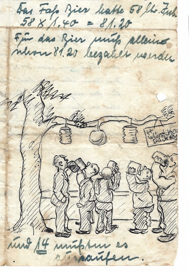 Eine Zeichnung aus einem handschriftlichen Laufzettel anlässlich der Abrechnung nach der Holzpartie, an der nur 1/3 der Sangesbrüder des MGV teilgenommen hatten